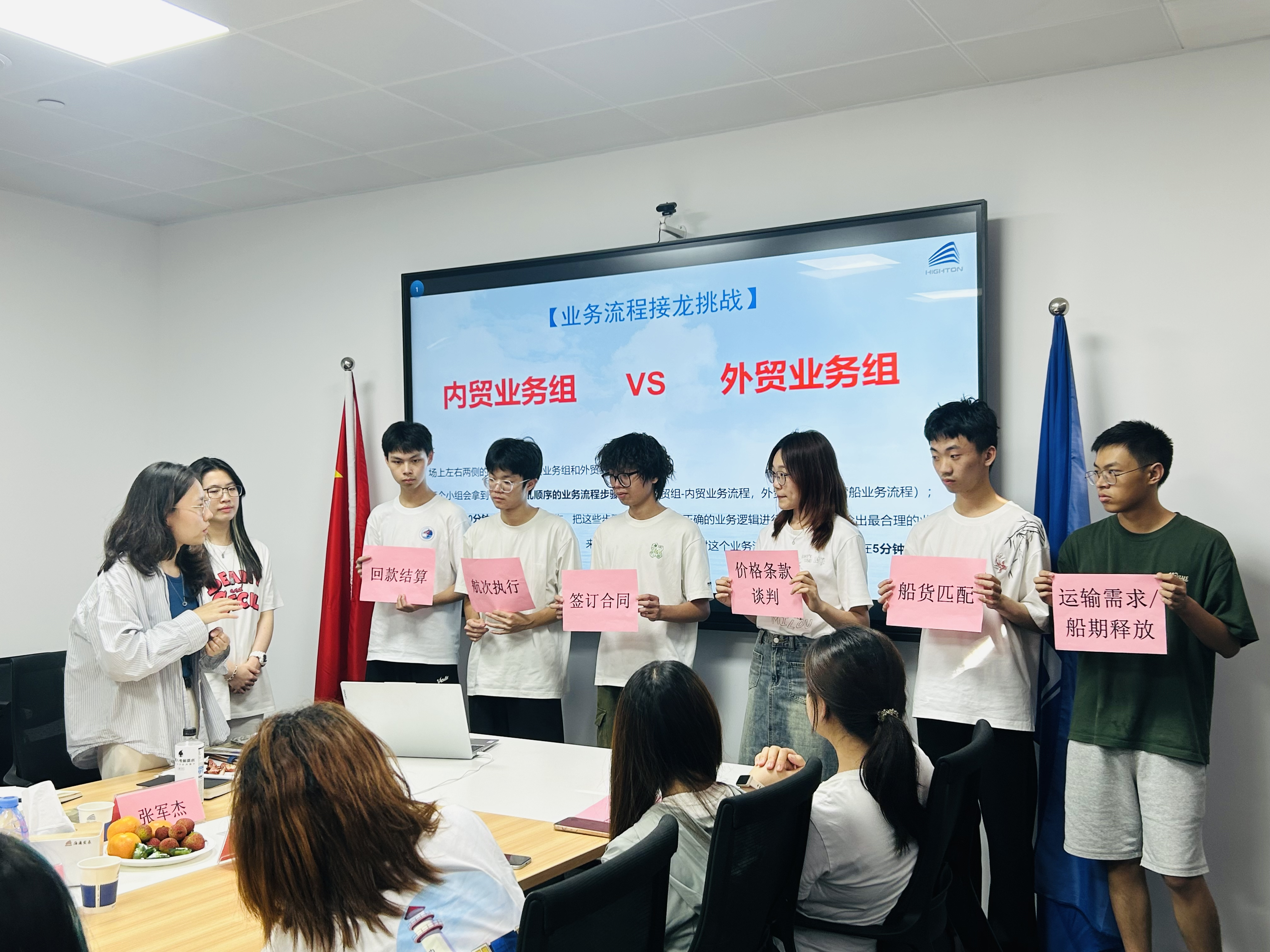 為加深學生對干散貨業(yè)務的理解,由海大優(yōu)秀校友擔任專業(yè)導師,學生們進行內(nèi)外貿(mào)業(yè)務流程接龍?zhí)魬?zhàn)互動環(huán)節(jié),18名學生分為內(nèi)貿(mào)業(yè)務、外貿(mào)業(yè)務兩個小組,在10分鐘內(nèi)完成業(yè)務流程排序與梳理。展示環(huán)節(jié)中,同學們通過流程碎片展示和現(xiàn)場解說,生動呈現(xiàn)了航運業(yè)務的關(guān)鍵節(jié)點。學長學姐們對學弟學妹們進行糾錯指導,同時系統(tǒng)講解了實際業(yè)務中的操作規(guī)范與要點。這種"實踐-展示-指導"的教學模式,有效幫助同學們將理論知識與實務相結(jié)合,助力學生更準確、深刻地掌握整體業(yè)務邏輯,提升認知效率。